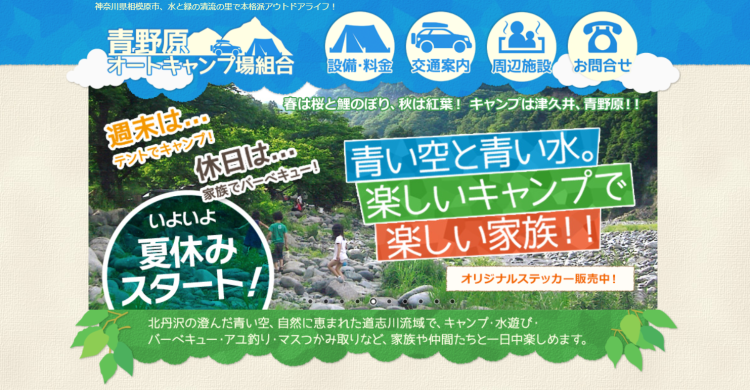 | 特徴 | 道志川流域の自然豊かなオートキャンプ場です。春は桜を眺めつつのバーベキュー、夏は河辺での水遊び、マスの釣りやつかみ取りが楽しめます。秋の色づく紅葉、冬の雪遊びと、一年を通じての楽しめます。 |
